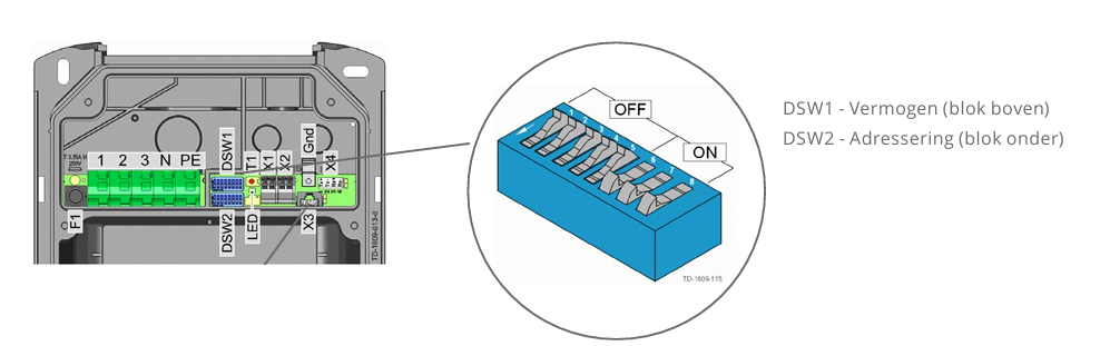 Note that you must first switch off the circuit breaker for the charging station and check that there is no more voltage on the circuit, before unscrewing the charging station. Open the Keba charging station. See the image for the location of the dipswitches for switching off Smart Charging.