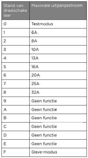 The rotary switch is currently still on F. The following table shows which number corresponds to which charging speed. For example, for charging at 3x 10A, position 3 must be selected. After setting the rotary switch to a fixed charging speed, Smart Charging is disabled.