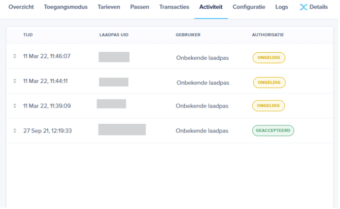 - Als er bij een laadpas “Ongeldig” staat onder “Authorisatie” dan is de laadpas niet geaccepteerd.