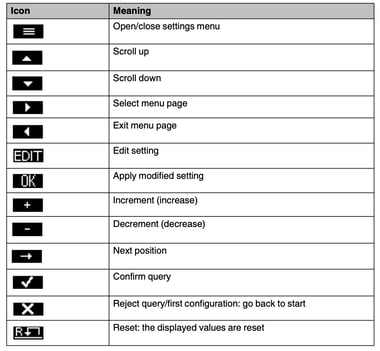 Het display toont iconen die aangeven welke actie beschikbaar is. Door op de knop onder het juiste icoon te drukken, voer je de gewenste actie uit.