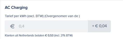 Basistarief: Bepaald door de eigenaar van de laadpaal via de Charge Point Operator (CPO) voor energie (€/kWh), parkeren (€/min) of per laadsessie (€/sessie). De eigenaar van de laadpaal ontvangt dit bedrag.