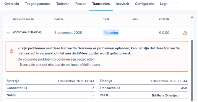 Deze foutmelding kan zich voordoen onder de transacties tab van een laadpaal.