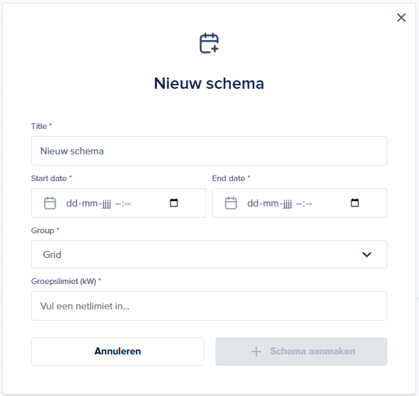 Start date / End date: Vul de datum en tijd in waarop het schema moet starten en stoppen